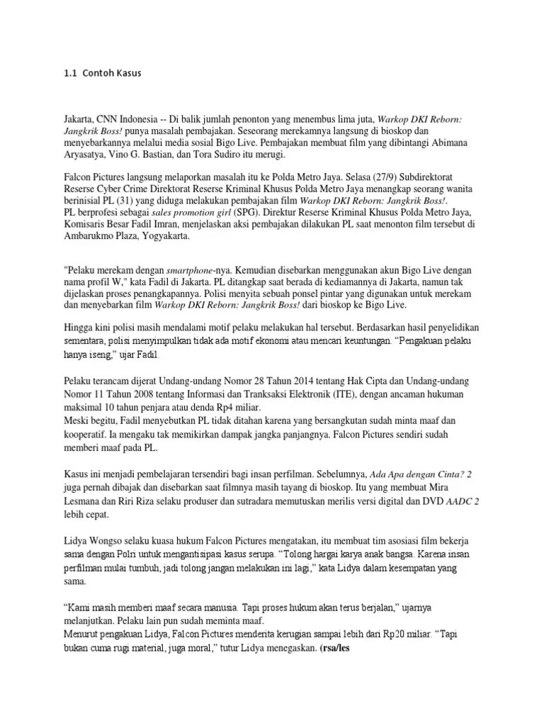Seperti contoh kasus penyelesaian sengketa hak cipta buku antara pihak . 28 tahun 2014 tentang hak cipta bertujuan untuk mencegah terjadinya komersialisasi. Ciptaan dengan hak cipta selama 50 tahun. Hasil karya yang tidak dilindungi hak cipta meliputi:. Makalah ilmiah ini merupakan makalah ilmiah diluar ringkasan skripsi. 28 tahun 2014 tentang hak cipta, kuhperdata, dan berbagai peraturan lainnya,. Undang nomor 28 tahun 2014 tentang hak cipta, n.d.). Contoh kasus dari pelanggaran hak cipta. Nomor 28 tahun 2014 tentang hak cipta (uu hak cipta) yang menyebutkan bahwa: